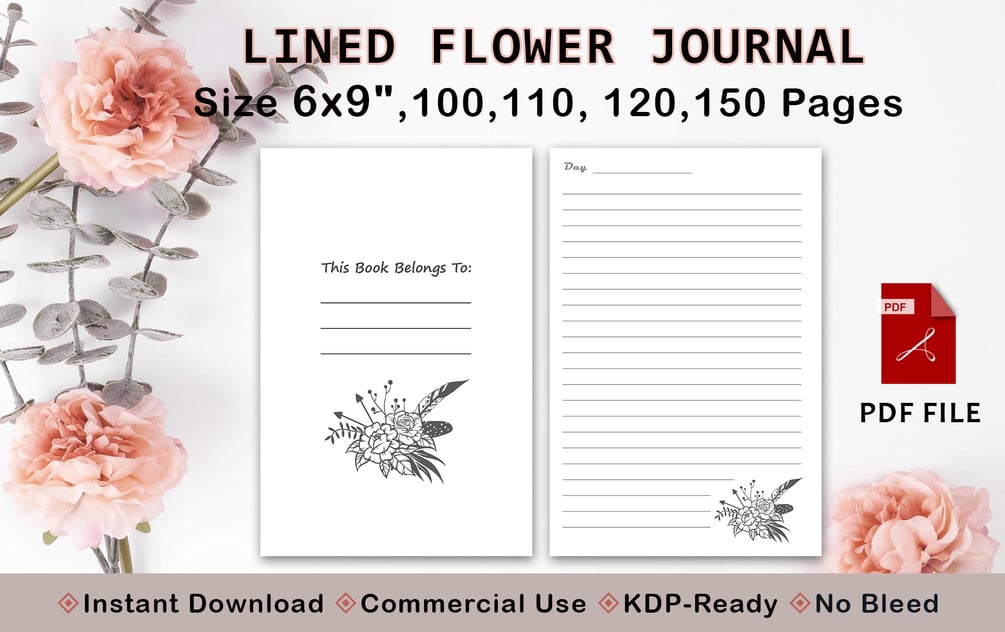 KDP Interior Download- 6"x9" Flower Lined Journal Paper -low content 100/110/120/150 pages, Notebook Template, Printable| Kindle Direct Publishing