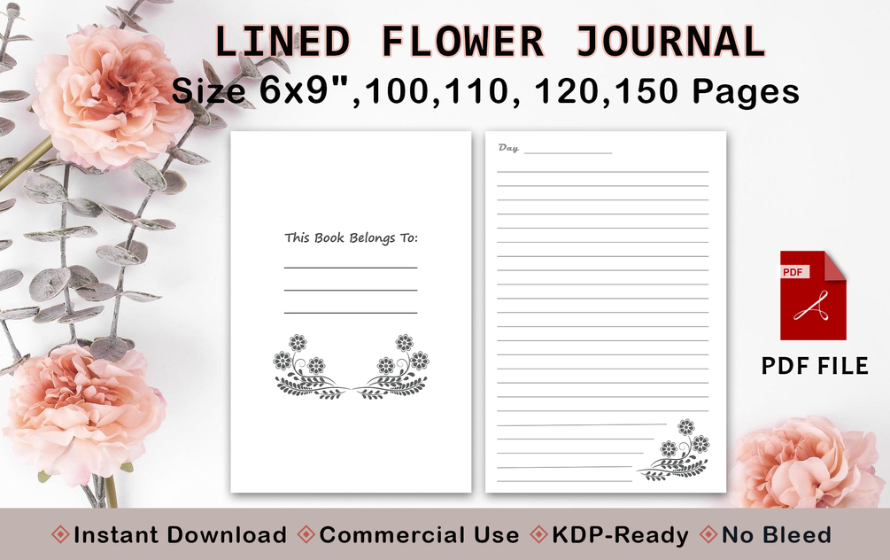 KDP Interior Download- 6"x9" Flower Lined Journal Paper -low content 100/110/120/150 pages, Notebook Template, Printable| Kindle Direct Publishing